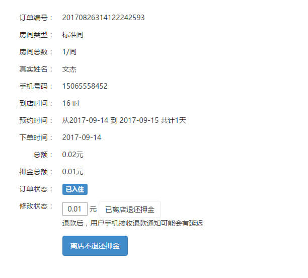 后台支持一键入住,一键退款、退押金、钟点房。支持微信支付、模板消息。客服实时收到新的订单信息,可以在手机端处理订单,支持按日期维护房价和房间数量,支持到店付款。支持积分功能,完成订房后获得的积分可以兑换代金券或优惠券,支持无线打印机和短信,评价打分功能,会员等级功能,二维码核销,积分或特产商城,会员充值